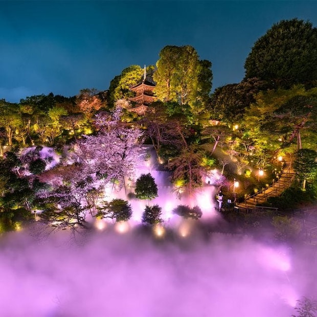 庭園に春の訪れを告げるのは、2月上旬の河津桜。そこから4月中旬まで、ソメイヨシノなど約20種100本の桜が順に見頃を迎える。注目は、ミストを使った幻想的な庭園演出「東京雲海」との共演。昼の爽やかな花景色はもちろん、桜色にライトアップされる夜の「夜桜雲海」もロマンティックで見逃せない。さらに、3月までは「ホテル椿山荘東京」のシンボルである約100種2,300本の椿と桜を同時に楽しめるチャンスなので、ぜひ期間中に訪れてみて。