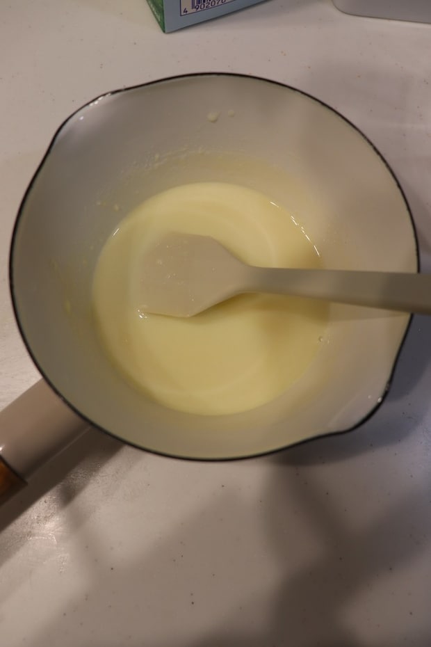 ⑧焼いている最中にクッキーの真ん中に入れる生チョコを作ります。ミルクパンにホワイトチョコレートと牛乳を入れ、弱火で温めます。とろみがついたら火からおろします。