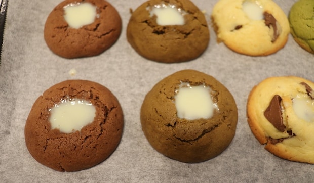 ⑩クッキーのくぼみに⑧の生チョコを注いでいきます。