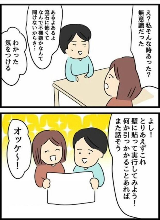 話し合うまでは、「こんな小さなことでもめたくない」とか「これくらい察してほしい」など、自分目線だけで考え、相手を思いやることができていませんでした。