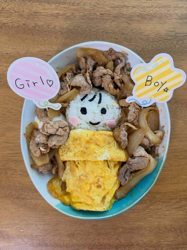 焼肉を添えたボリューミーなオムライス。赤ちゃんをかたどったライスの上に、黄色い卵のお布団がのっており、お布団をめくるとハート型のハムの位置で男児か女児かが示されています。