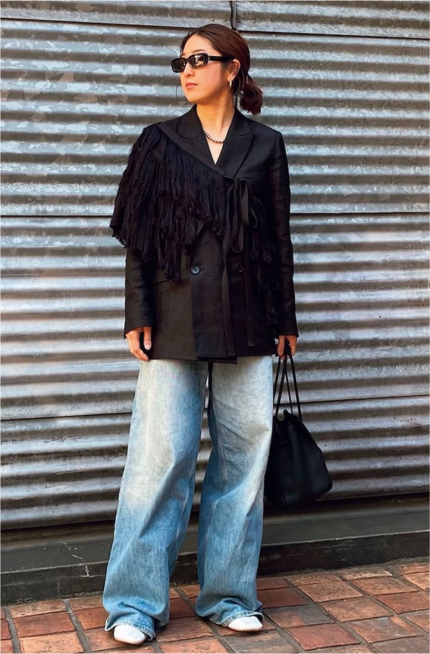 ジャケット¥39,600(アンクレイヴ ホワイト)、ハイクルのデニム、上から巻いたミディアムのフリンジスカート、d239のシューズ、コス×リンダ ファローのサングラス、イッチ×スタイリング/のバッグ、アフター シェイブ クラブのジュエリーは本人私物