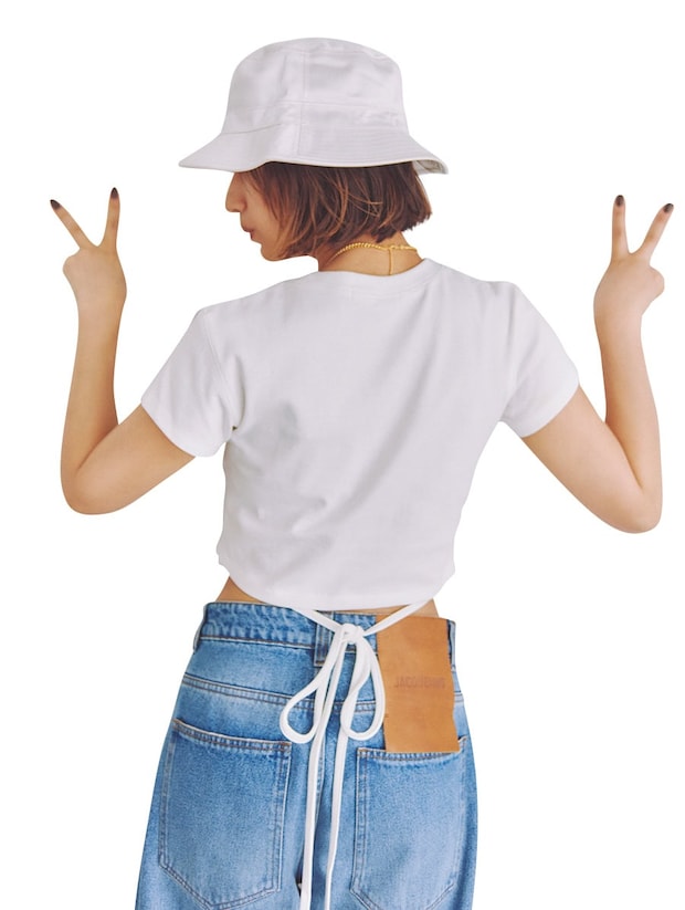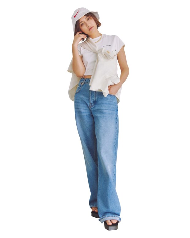 「普段はシンプルな白Tを着ることが多いのですが、韓国に行ったばかりなので、韓国らしいコンパクトなクロップドTにボリュームデニムでシルエットのコントラストを楽しみました。ジャケットを巻いてアクセントに」