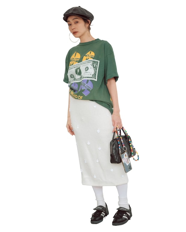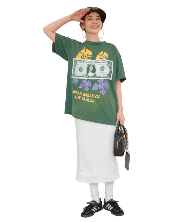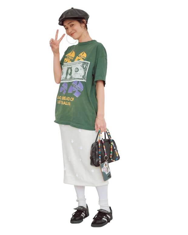 SAINTのTシャツ、ZARAのスカート、adidasのスニーカー、Comme des Garçonsのバッグ、H&Mのピアス、KIUNAの左腕ブレスレット、Marie-Hélène de Taillacの右腕ブレスレット、BLAMINKで購入したリング、SOLARIS & CO.のキャスケットは本人私物