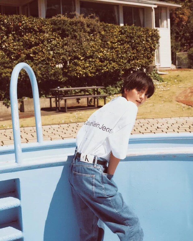 Tシャツ¥12,100、デニムパンツ¥27,500、ベルト¥16,500(全てカルバン・クライン ジーンズ/カルバン・クライン カスタマーサービス)