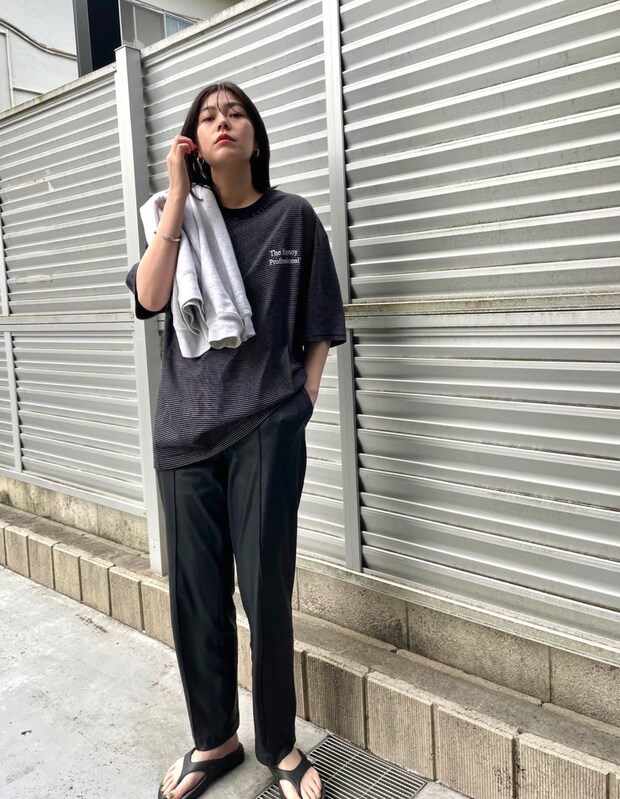 ENNOYのTシャツ、mullerofyoshiokuboのパンツ、肩に掛けたouidaのパーカー、oofosのサンダルは本人私物