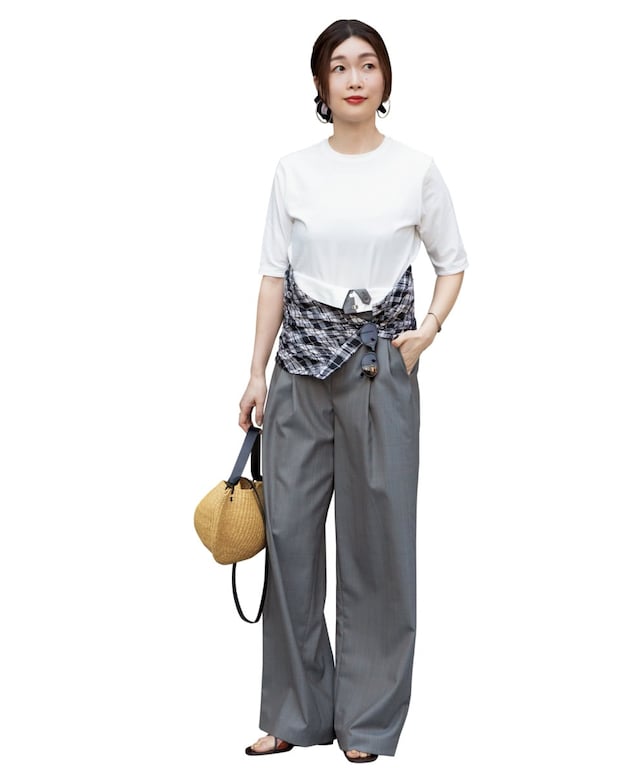 Tシャツ¥16,500(ザ・ニューハウス)、パンツ¥116,600(ティビ)、サングラス¥46,200(DMY ステュディオス)、サンダル¥35,200(ジェーン スミス/全てジャーナル スタンダード レサージュ 銀座店)、腰に巻いたヴィンテージのビスチェ、INES BRESSANDのバッグ、その他は本人私物