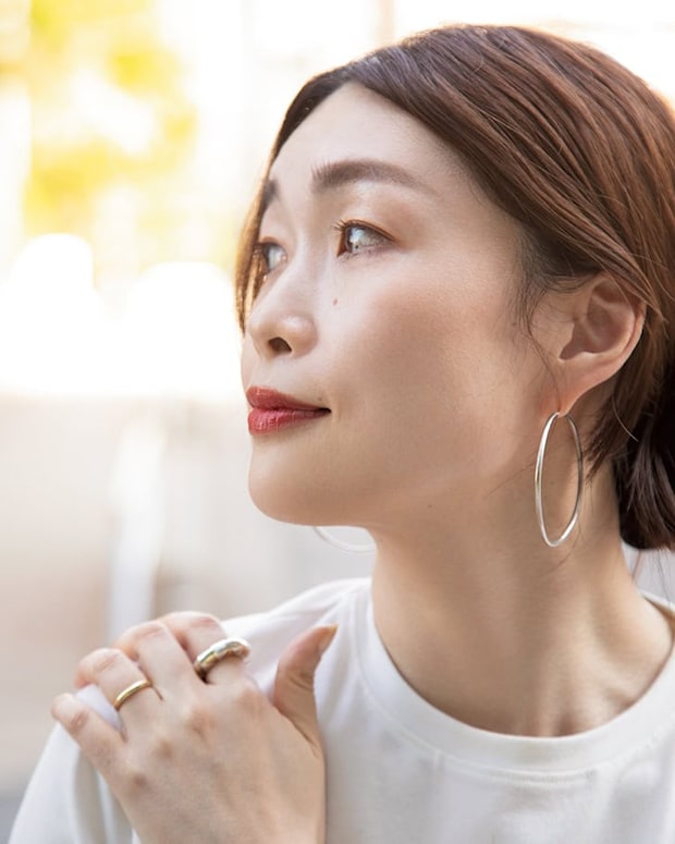 赤いルージュをきかせてシンプルな着こなしを華やかに