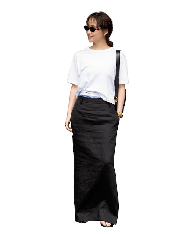 Tシャツ¥14,300、スカート¥33,000(共にドゥーズィエム クラス/ドゥーズィエム クラス 青山)、下に重ねたHomme Girlsのショーツ、JIL SANDERのバッグ、TOTEMEのシューズ、MIU MIUのサングラス、その他は本人私物