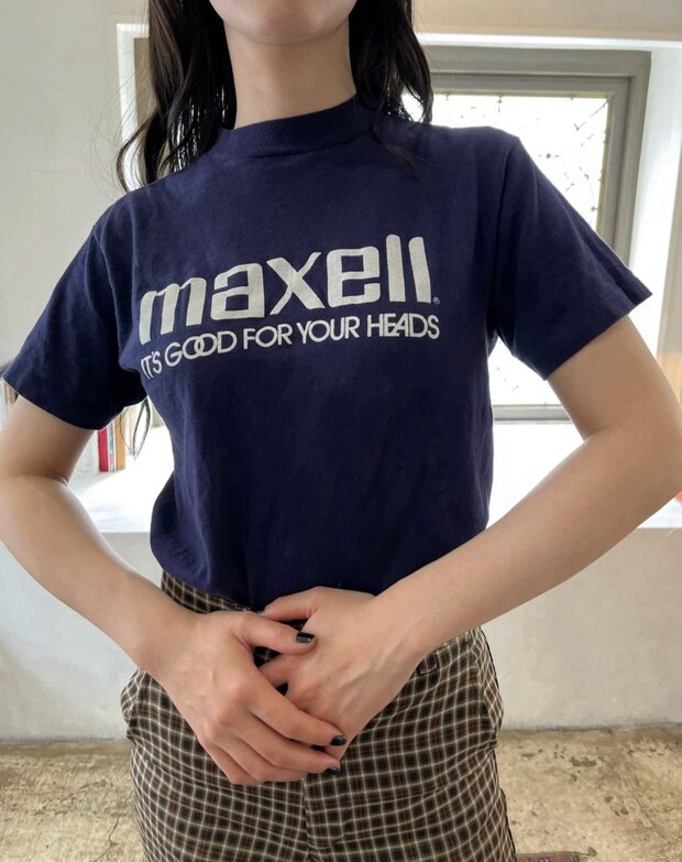 「夏のTシャツスタイルはシンプルになりやすいので、“maxell”が目を引く90年代のロゴ Tを主役に色の掛け合わせで遊びを出しました。Tシャツを着る際はカジュアルダウンし過ぎないようにシルエットがキレイなパンツを合わせるように意識しています」