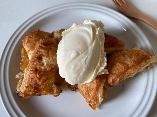 おすすめは、トースターで1~2分焼くこと。表面の砂糖が溶けてカリッとキャラメリゼされ、楽しい食感に変わります。サックリした生地の中から、とろりとしたアップルフィリングが現れ、その甘酸っぱさと、シナモンのほのかな香りが絶妙なバランスです。