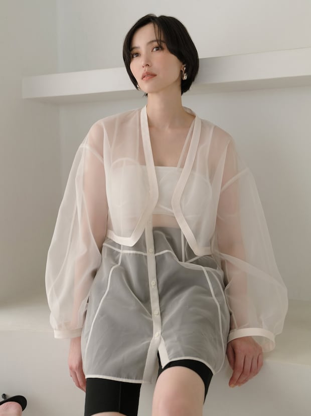 オーガンジートップス¥23,100、オーガンジーショートジャケット¥25,300、チューブトップ¥7,150、ハーフパンツ¥16,500(全てイウエン マトフ/ユナイテッドアローズ 渋谷スクランブルスクエア店)、ピアス¥9,900(ユナイテッドアローズ/ユナイテッドアローズ 丸の内店)