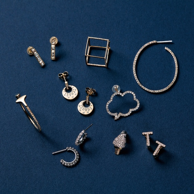 右上から順に:シングルピアス[K18WG×ブラウンDIA]¥308,000(オー/ハルミ ショールーム)、キューブピアス[K18YG×DIA]¥187,000(シハラ/シハラ トウキョウ)、ピアス[K18YG×DIA]¥231,000(ベルシオラ)、ピアス[K10YG×DIA]¥102,300(モーコ コバヤシ×オールニーク)、ピアス[K18YG×DIA]¥220,000 (スタージュエリー/スタージュエリー表参道ヒルズ店)、イヤリング[K14YG×ホワイトDIA]¥176,000 (ベッティーナ ジャヴァエリ/ロンハーマン)、ピアス[K18YG×K18WG※キャッチのみステンレス×DIA]¥137,500(エナソルーナ)、ピアス[PT×DIA×モルガナイト]¥187,000(narin.)、イヤーカフ[K10YG×DIA]¥158,400 (ヒロタカ/ヒロタカ 表参道ヒルズ)