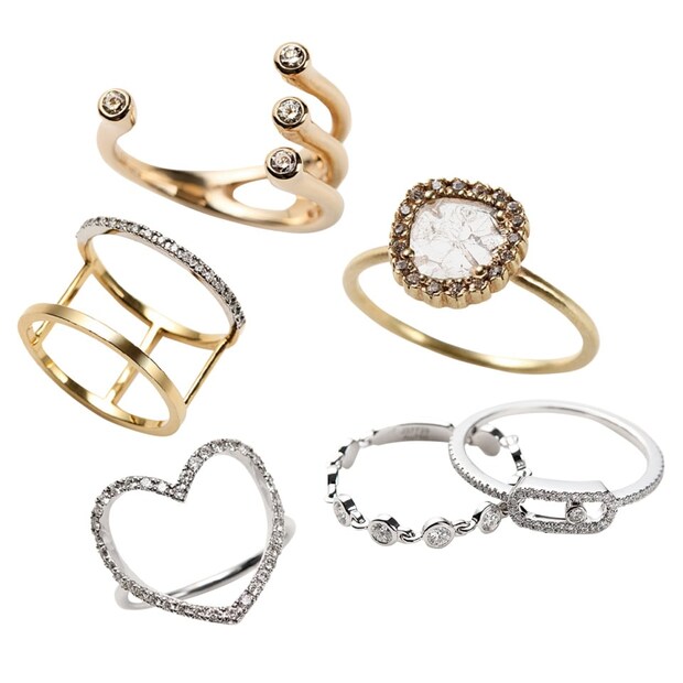 右上から半時計周りに:スライスダイヤモンドリング[K18YG×K18YGプレート×DIA]¥176,000 (アルティーダ ウード/THE ANOTHER MUSEUM)、カフリング[K10YG×DIA]¥138,600 (ヒロタカ/ヒロタカ 表参道ヒルズ)、2連リング[K18YG×K18WG×DIA]¥151,800 (ヴァンドーム青山/ヴァンドーム青山本店) 、上:リング[K18WG×DIA]¥253,000、下:リング[K18WG×DIA]¥220,000(共にメシカ/メシカジャパン)5. ハートリング[K18WG×DIA]¥297,000(エナソルーナ)