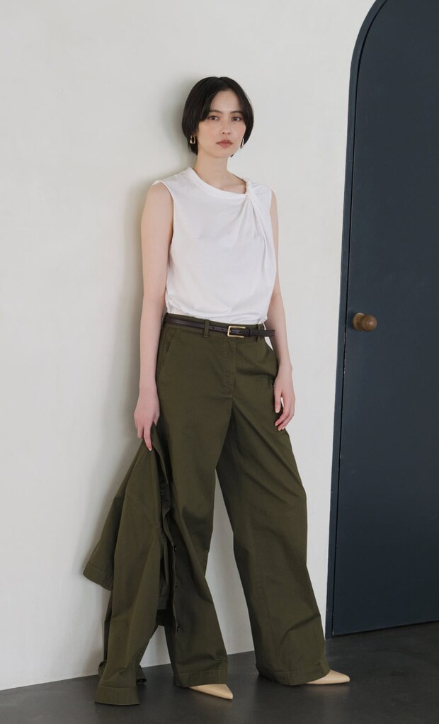ノースリーブシャツ¥15,400、手に持ったジャケット¥42,900、パンツ¥35,200、ベルト¥19,800(全てセオリー/リンク・セオリー・ジャパン)、ピアス¥39,600(ボーニー/エドストローム オフィス)、パンプス¥82,500(ジアボルギーニ/ラディモ・インク)