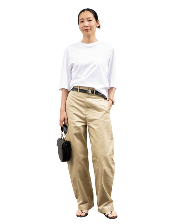 Tシャツ¥15,400(ロエフ/エイチ ビューティー&ユース)、パンツ¥12,100(マルゥ ユナイテッドアローズ)、サンダル¥13,200(シー ユナイテッドアローズ/共にユナイテッドアローズ カスタマーサービスデスク)、バッグ¥152,900(ワンドラー/ユナイテッドアローズ 心斎橋店)、ネックレス¥24,200(アルポ パリ/ユナイテッドアローズ 原宿本店)、ピアス¥27,500(ラグバッグストゥディオズ/ユナイテッドアローズ ルクア大阪 ウイメンズストア)、その他は本人私物