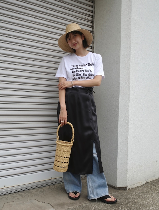 「Tシャツとデニムのワンツーコーデにならないようにパレオ型のスカートをレイヤード。ロゴTやデニムといったカジュアルアイテムと女性らしいサテン素材のパレオというバランスが◎。夏はスタイリングがシンプルになりがちなのでフォルムに特徴のあるハットやカゴバッグをポイントにしたスタイルを楽しんでいます」