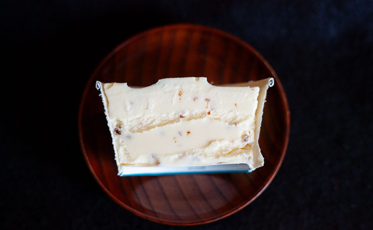 最近はあまり話題になりませんが、フタを開けたらハートの形! アイスクリームの中に茶色の粒が見えますが、これがカラメルチップです。