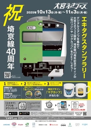 また、10月13日(月・祝)~11月3日(月・祝)の期間、埼京線開業40周年を記念した「エキタグスタンプラリー」が開催される。対象施設に設置されたデジタルスタンプを集めて、条件を達成すると、大宮えきフェス限定・埼京線40周年記念デザインの「缶バッジ」や「マグカップ」をGETできる。