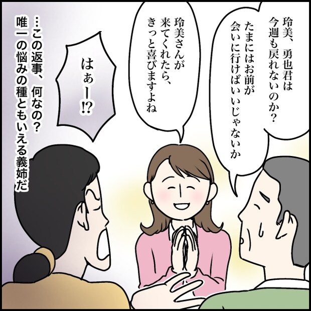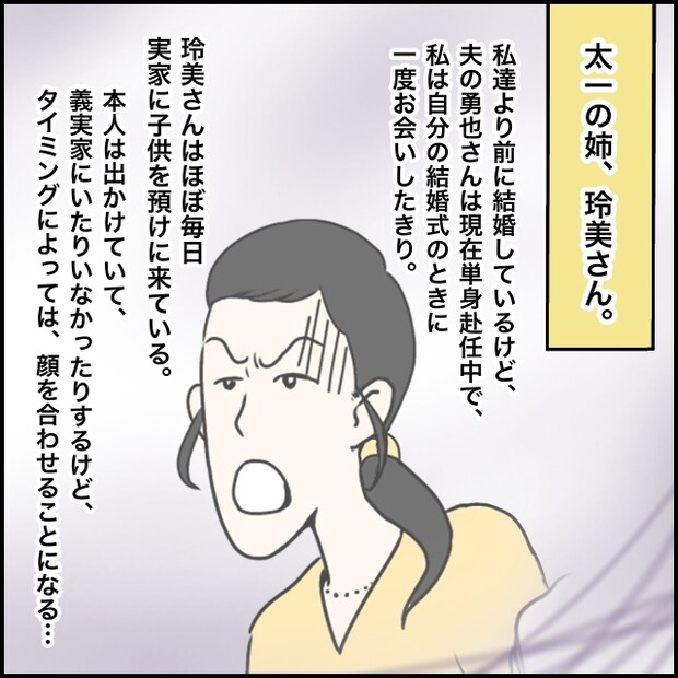 太一の姉、玲美さん。私達より前に結婚しているけど、夫の勇也さんは現在単身赴任中で、私は自分の結婚式のときに一度お会いしたきり。玲美さんは、ほぼ毎日実家に子どもを預けに来ていて、玲美さん本人は出かけてしまい、義実家にいたりいなかったりなのですが、タイミングによっては顔を合わせることもあるのです。