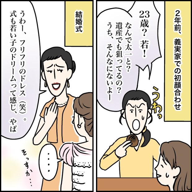 「23歳?若!なんで太一と?遺産でも狙ってるの?うち、そんなにないよー」とその時から嫌われていると実感。結婚式では、「うわー、フリフリのドレス(笑)。式も若い子のドリームって感じ、やば」とバカにされ言葉も出ませんでした。