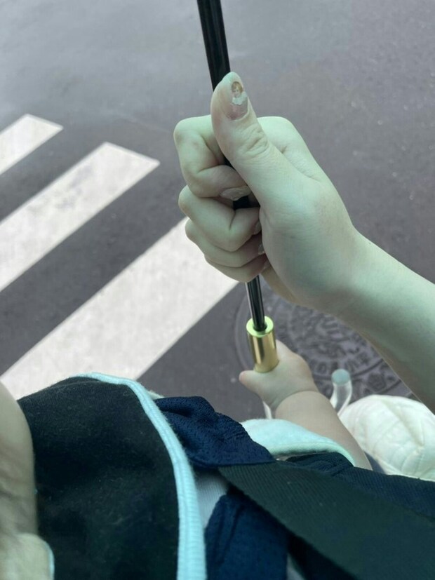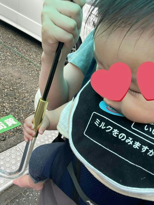 抱っこひもをしながら傘を差していたこっちゅさん。娘さんは小さな手で傘をぎゅっと握り、まるで「持ってあげる!」と言っているかのよう。ママに抱っこされてお出かけはとても楽しそうですが、さらに傘も持って大満足な様子が写真から伝わってきます。