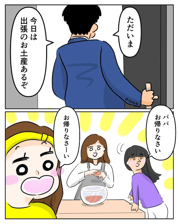 すると、「ただいま、今日は出張のお土産あるぞ」と達夫さんが仕事から帰ってきました。愛花もすっかりパパに懐いた様子で、くれあと並んで「お帰りなさい」と笑顔で出迎えます。