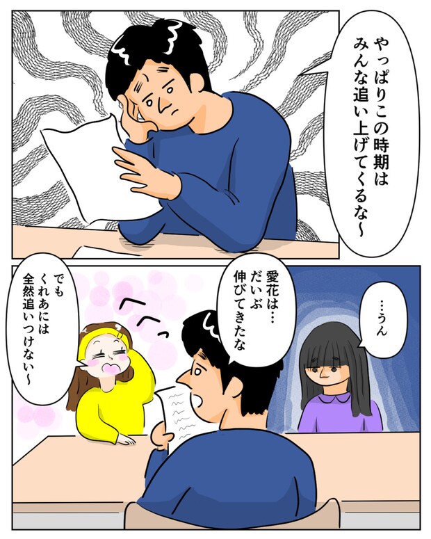 さらに時が流れ、季節は11月後半。「やっぱり、この時期はみんな追い上げてくるな~」くれあの模試の結果を見つめながら、達夫さんが難しい表情でつぶやきました。実はこの頃から、くれあは成績上位者の枠から外れるように。その一方で、愛花は着実に成績を伸ばしてきていました。「愛花はだいぶ伸びてきたな」そう褒められると、愛花は照れくさそうに「でもくれあには全然追いつけない~」と言いました。