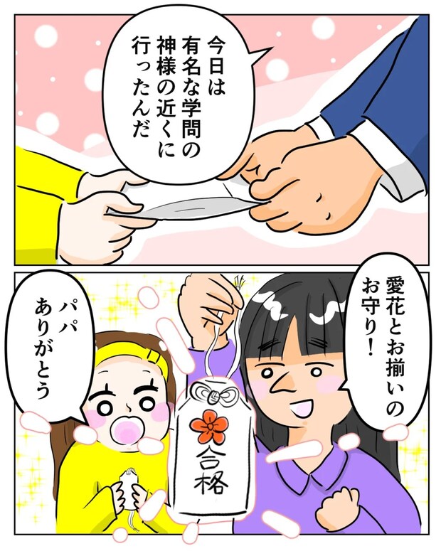 「今日は有名な学問の神様の近くに行ったんだ」達夫さんはそう言って、愛花とくれあにお守りを渡しました。封を開けた2人は大喜び。「愛花とおそろいのお守り!パパ、ありがとう」と、嬉しそうに声をそろえてお礼を言いました。