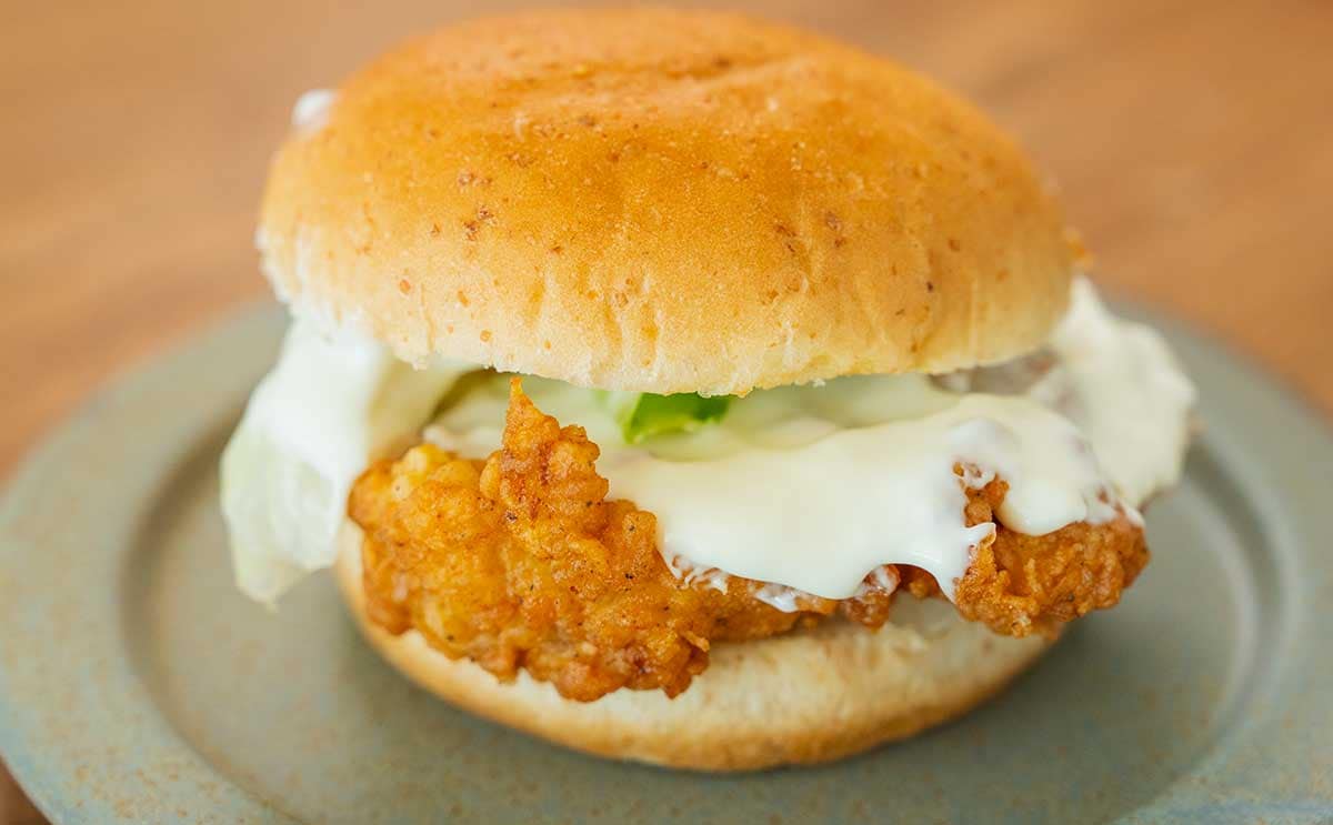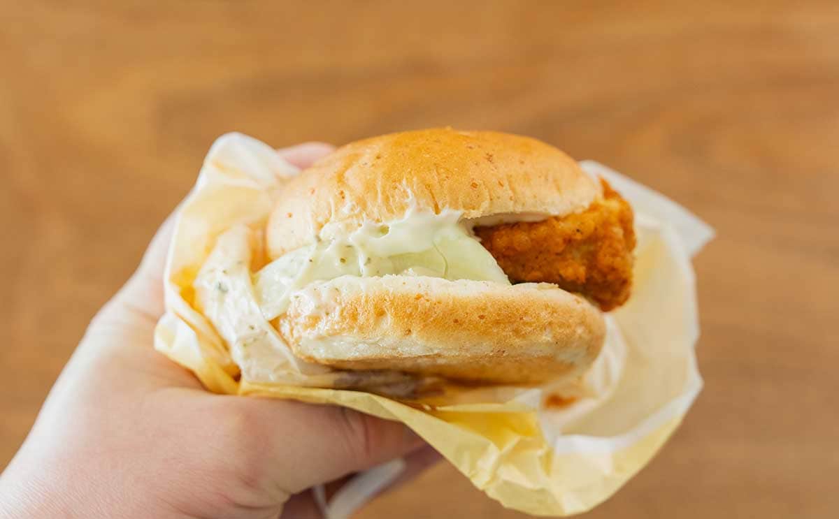 「チーズにおぼれるフィレバーガー(クリ〜ミ〜モッツァレラ)」を手に持つとこんな感じ。バンズのあいだからチキンフィレがはみ出していますね。