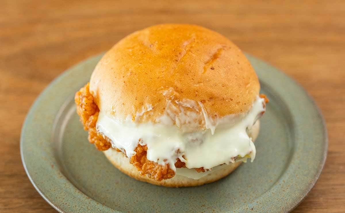 ひとくち食べた瞬間に、モッツァレラチーズのまろやかでクリーミーな味わいが口いっぱいに広がって最高! しっとり&ジューシーなチキンフィレとの相性が抜群に良いですね。でもそれだけでなく、バジルチーズソースも使われているため、あとからバジルの爽やかな風味も感じられます。チーズソースがたっぷりと使われていますが、バジルのおかげでくどさを感じない食べ心地になっていますね。
