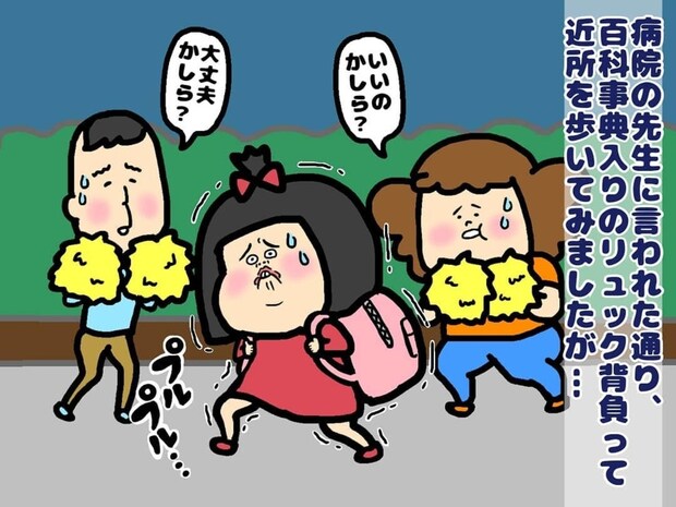 整形外科を受診し、足が細すぎることを指摘された主人公。医師のアドバイスを受けて、百科事典を入れた重たいリュックを背負って近所を歩くトレーニングを始めました。