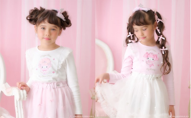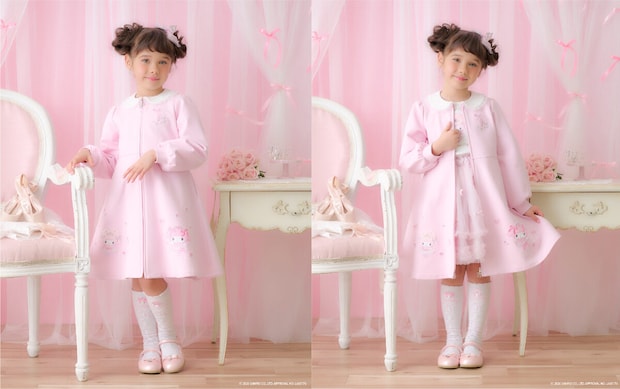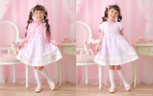 マイメロディとマイスウィートピアノの刺繍ワッペンが付いたカーディガンは、リボンを取り入れたデザイン。袖口のリボンが、より一層華やかな印象です。バレリーナ柄ワンピースは、胸元のレースアップがポイント。オリジナルの総柄プリント、裾の豪華な刺繍とアップリケにも注目です。