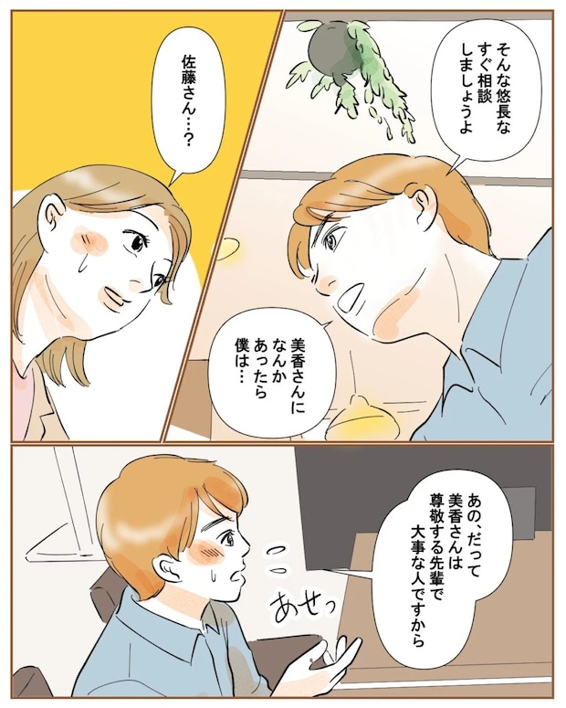 「そんな悠長な。すぐ相談しましょうよ。美香さんになんかあったら僕は・・」と前のめりな佐藤さんに驚いた私が、「佐藤さん・・?」と声をかけると「あの、だって美香さんは尊敬する先輩で大事な人ですから」と、なんだか焦ったように答えました。