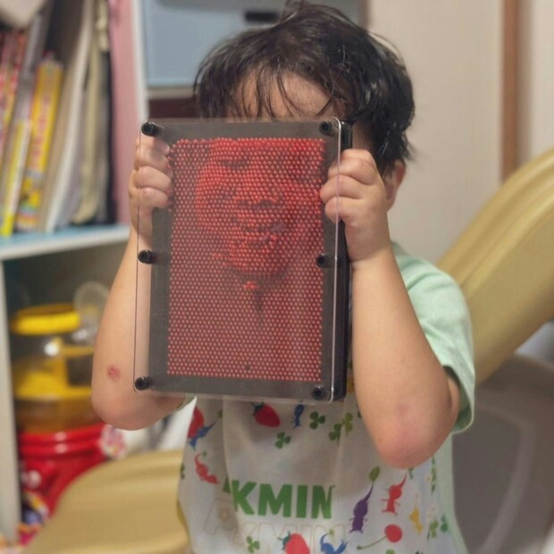 3Dピンアートに、思いっきり顔を押し付けているりりさんのお子さん。とても楽しく遊んでいる様子が、ピンアート越しにひしひしと伝わってきますね。こんなにもいい顔をしてくれたら、パパもおもちゃをあげたかいがあったのではないでしょうか。