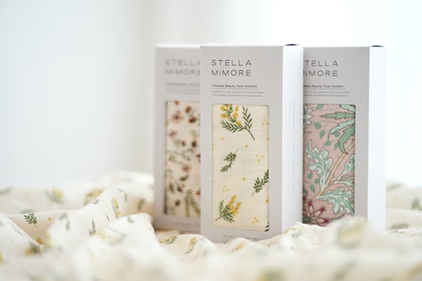 通常はオンラインを中心に展開するステラミモアの商品を、実際に手に取り、質感や柄を選べる貴重な機会となる。会場にはウィリアム・モリスのデザインをはじめ、春の訪れを祝うミモザなど、赤ちゃんとの日々にそっと寄り添う「幸せベビーギフト」を厳選。