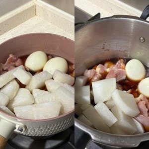 3.別々の鍋に冷凍大根と生の大根をそれぞれ入れて、大根以外の食材や調味料は全て同量で火にかけます。