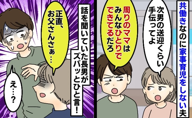 夫の仕事は、週のほとんどが在宅勤務。私は週5日のパートタイムで共働き夫婦です。忙しいのはお互い同じはずなのに、夫は子どものことをすべて私に任せきり。手伝ってほしいと頼むと周りのママたちと比べる発言をしてきてカチン! すると、13歳の長男がやってきて……?