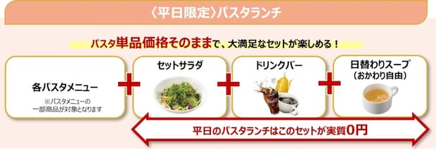 平日10時30分から17時までの時間帯限定(土日祝除く)で、グランドメニューを単品価格そのままに、セットメニューが追加料金なしで付いてくる。グリルメニューではライス(大盛り無料)またはパンと日替わりスープが、パスタメニューではセットサラダ、ドリンクバー、日替わりスープが提供される。