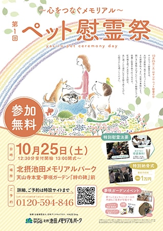 霊園・墓石のヤシロは10月25日(土)に、「第1回ペット慰霊祭~心をつなぐメモリアル~」を大阪府池田市の北摂池田メモリアルパーク内で開催。当日は合同慰霊法要をはじめ、特別納骨式やその他イベントも実施する。