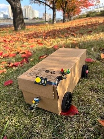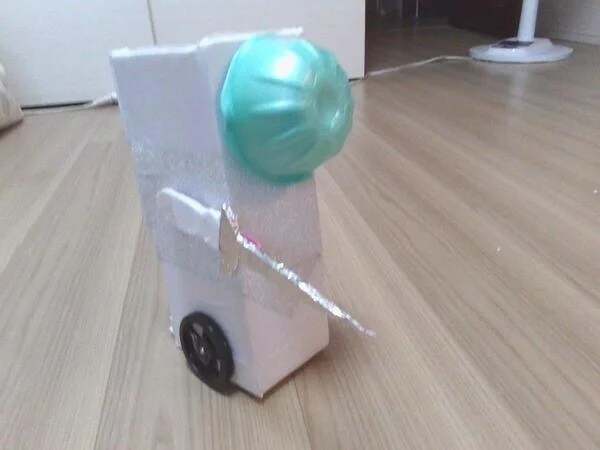 作者による作品の説明は、「届けたい荷物をのせて拍手をすると、ライトが緑に光り、発進して荷物を届けます。受け取る人の前でライトが赤になり、自動で止まります。荷物を受け取りボタンを押すと、ライトが黄色く光り、戻って来て止まります」。