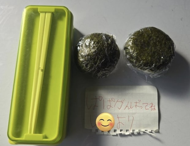 Takaさんがお昼にお弁当を開けるとそこには、丸くきれいに握られた2個のおにぎりと「ぱぱがんばってね」とお手紙が。事前に知っていてもうれしいですが、不意打ちだと余計に泣けてしまいますね。息子さんが作ってくれたと思うとより美味しく感じられそうです。