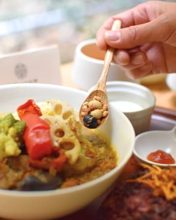 さらにチャツネで味を変えたり、黒文字パウダーとヨーグルトを入れてまろやかにしたり、小川生薬オリジナルの国産はとむぎグラノーラでカリッとした食感をプラスしたりと、一皿で何通りもの楽しみ方ができるように設計。