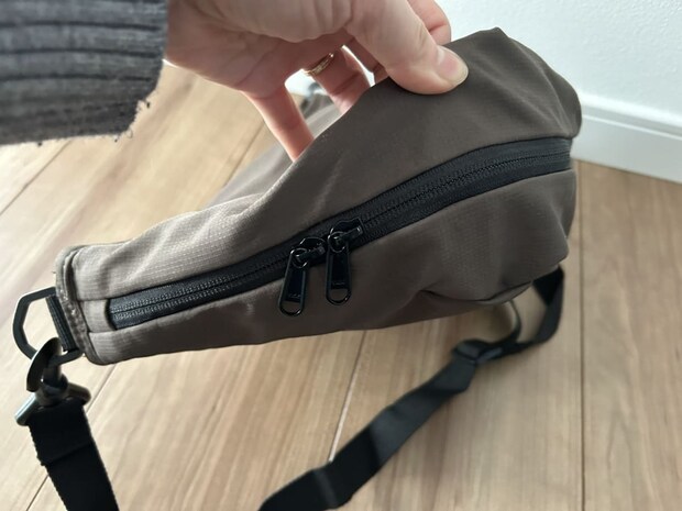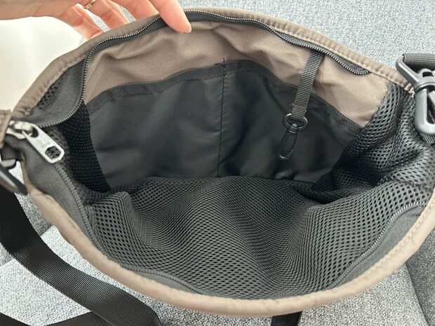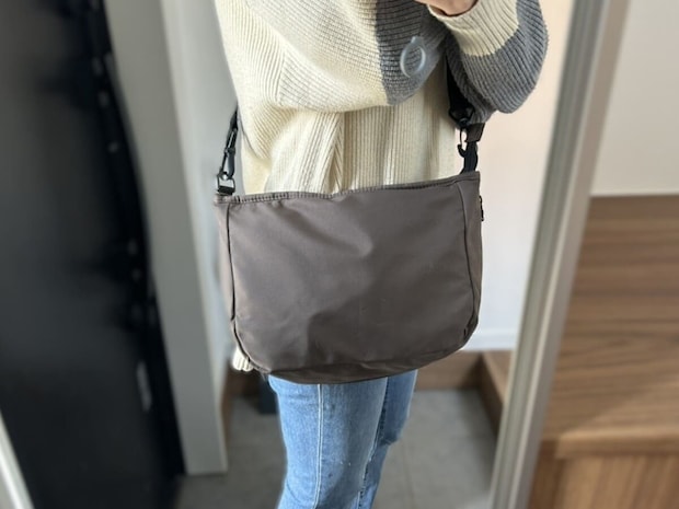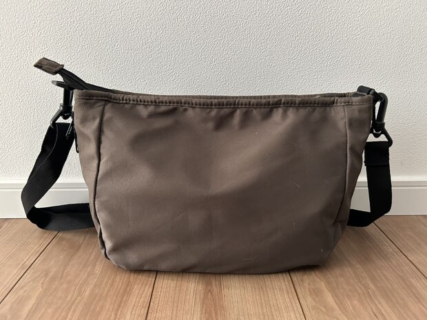 素材はポリエステル100%で、見た目はよくある軽量のショルダーバッグですが、底部にファスナーがあるのがほかとは違うポイント。