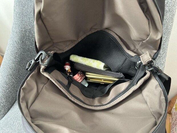 裏側にはリュック部分が収納されているので若干かさばり感はあるものの、お財布、ハンカチ、ティッシュケース、ハンドクリーム、パウダー、リップを入れてもまだ余裕がある収納力です。