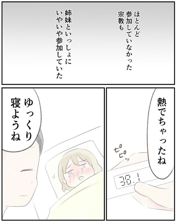 ゆうさんは、夫の宗教の集まりにも行きたくないのに娘たちを連れて参加していました。ある日、娘が熱を出したので夫に集まりを休むというと怒られてしまいます。なんとか宗教をやめる方法はないかとSNSに投稿してみたところ…。