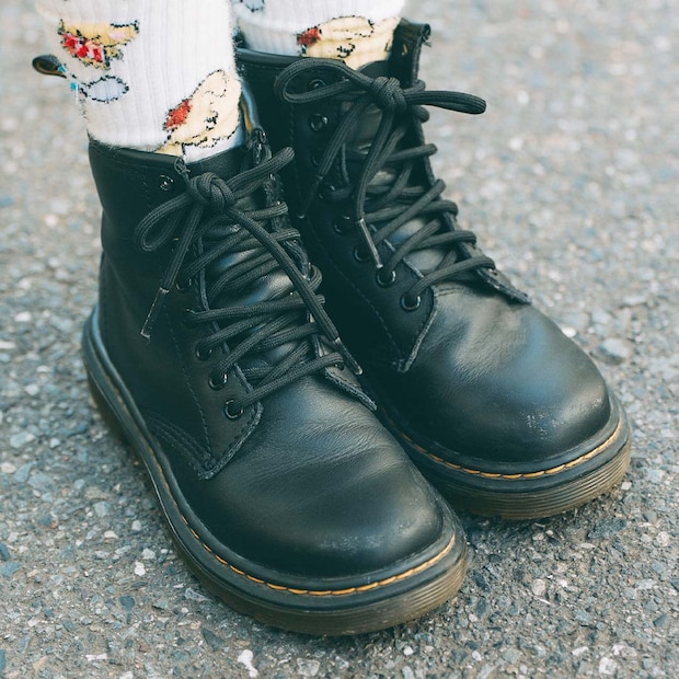 『ドクター マーチン』のブーツで辛口な足元にアップデート!キュートなソックスがチラ見えするのがポイント。