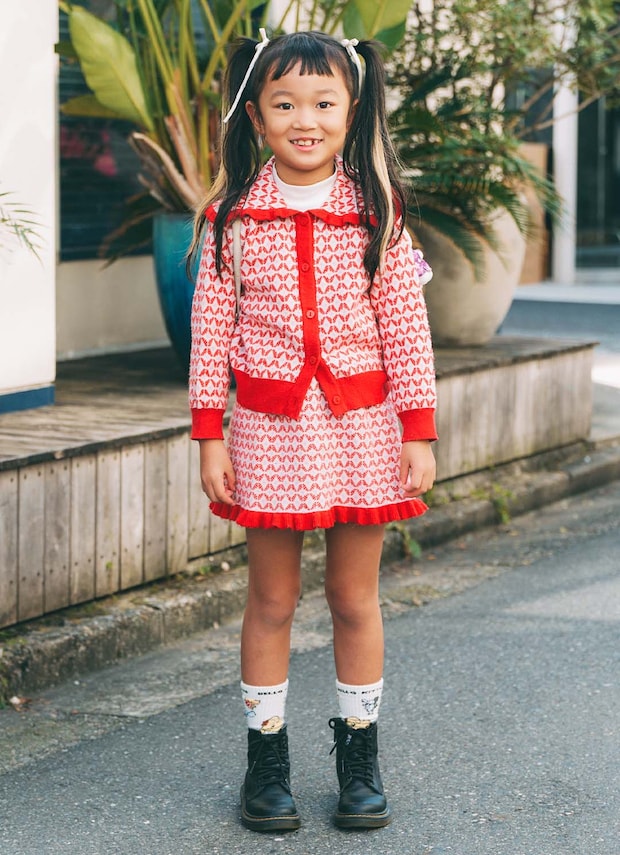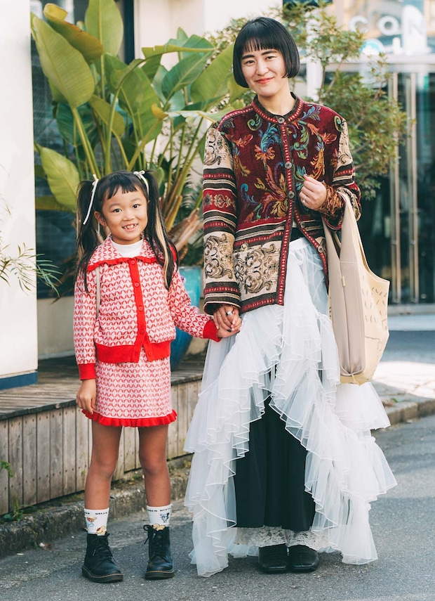 ママはゴブラン柄、キッズはレトロ柄ニットと、それぞれ個性的な柄物を主役にした親子コーデ。違った柄や素材を取り入れてもまとまってみえるのは、色をポイントで拾っているから。キャラクターアイテムを挿して、ユニークさを演出したのも見逃せない!