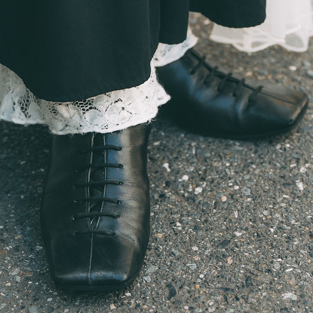 ブラックレザーのシューズで甘めコーデを引き締めて。すっきりしたシルエットでボリューミーなボトムスとも好バランス。