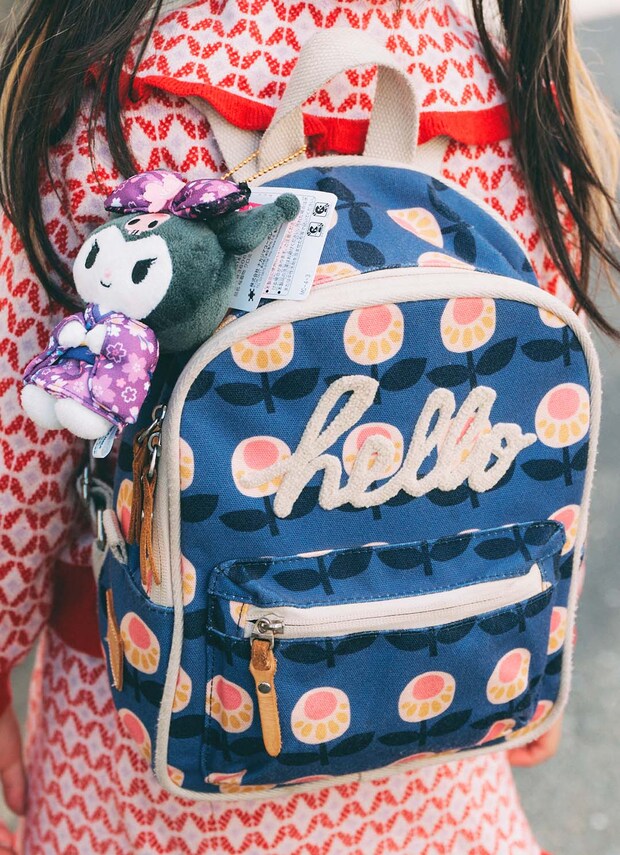 ブルーのリュックはレトロな花柄がキュート!レッドのセットアップによく映えるカラーリング。